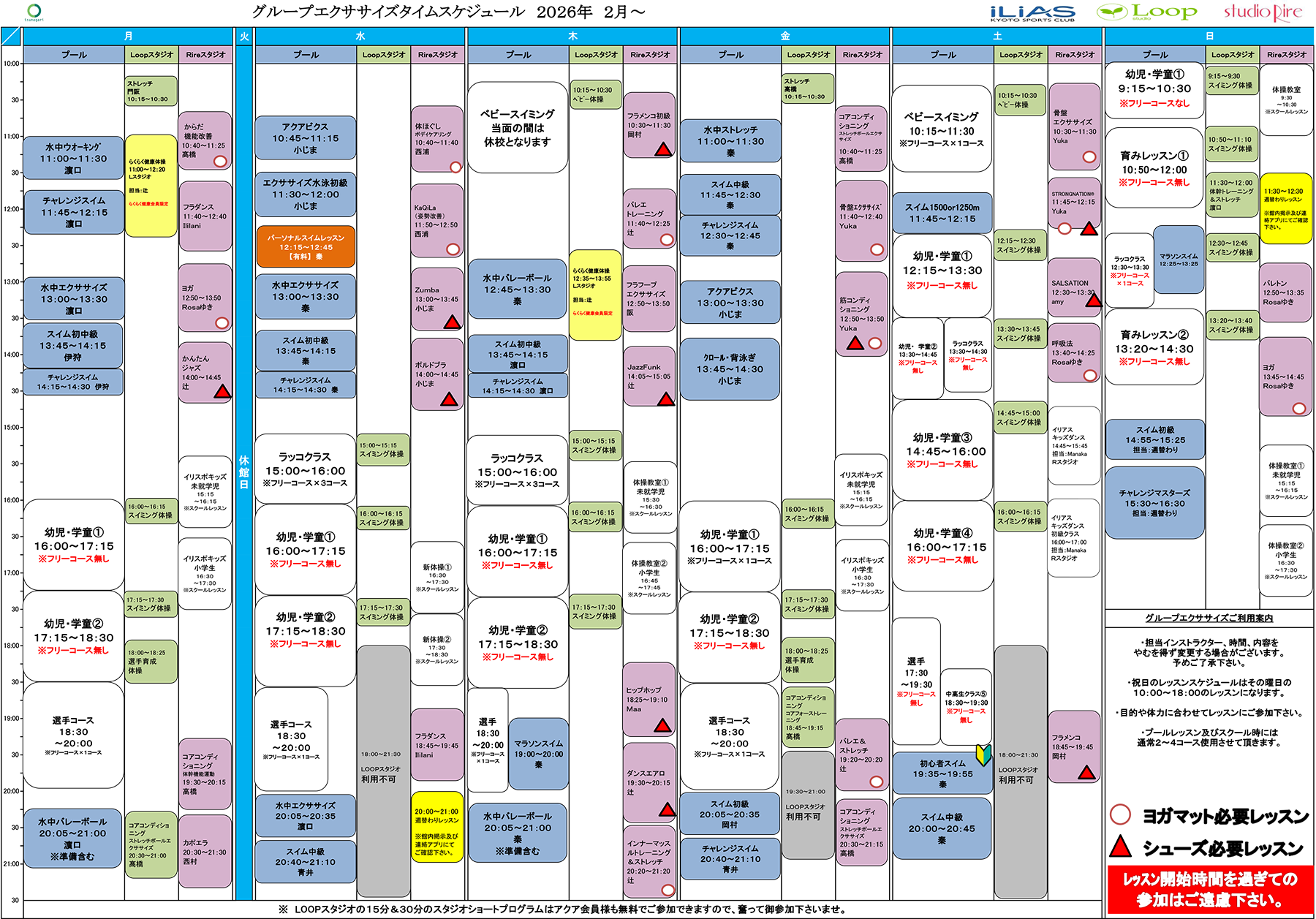 ・ 都合により担当のインストラクター、時間、内容は止むを得ず変更になる場合がございます。事前に代講・休講情報をご確認ください。